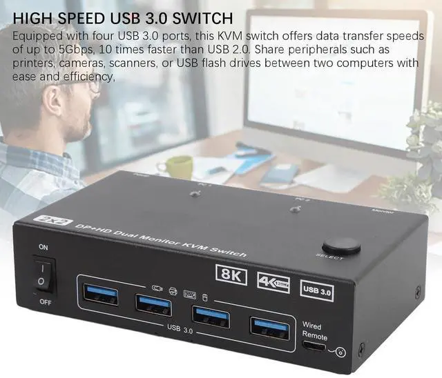 ULTRA HIGH DEFINITION: Supporting resolutions up to 8K at. 60Hz and 4K at. 120Hz, this KVM switcher ensures clear visual experiences. It's backward compatible with 4K at. 60Hz, 1080P, and 720P, and it automatically recognizes resolutions when switching between sources.