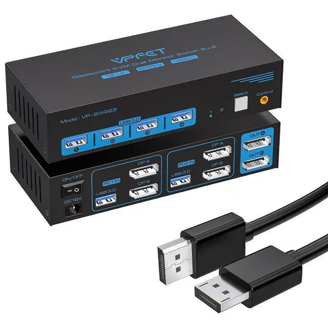 Displayport Dual Monitor KVM Switch: The DP KVM switch allows two computers or laptops to share two monitors and four USB devices, switching to the monitor and mouse keyboard and other devices to the other computer with a single click, eliminating the need to plug and unplug cables, simplifying cabling, and improving your efficiency and experience. Note: Both computers need to have 2 DP output ports and both monitors need to have DP connectors to use the switcher. It is recommended that all ca