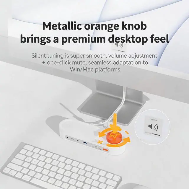 • Premium Knob ControlMetallic orange knob adds a refined desktop touch. Supports smooth volume adjustment and onetouch mute, seamlessly compatible with Win/Mac platforms.