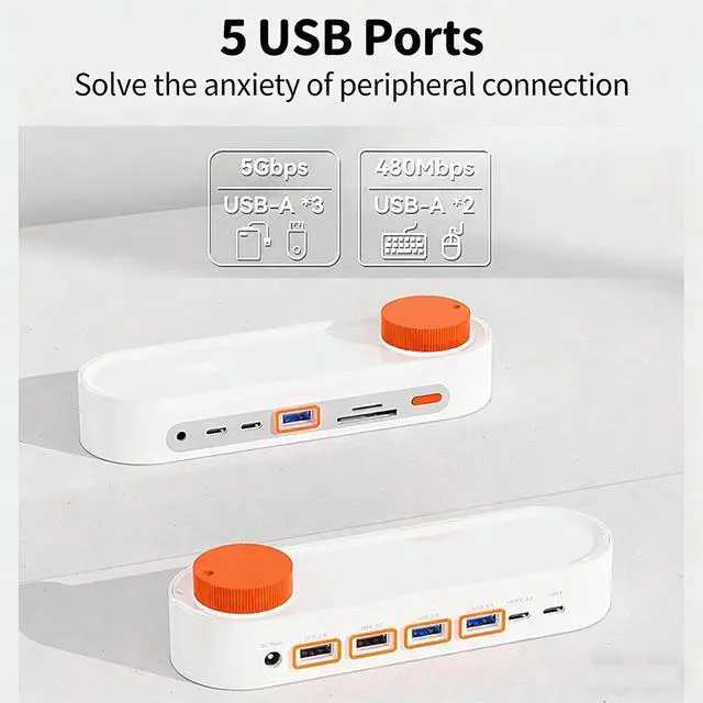 Stylish & FunctionalWhiteorange minimalist design enhances workspace aesthetics. Flexible cable options, dualangle support, and 360° rotation ensure compatibility with desktops and laptops alike.