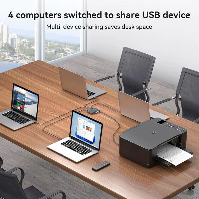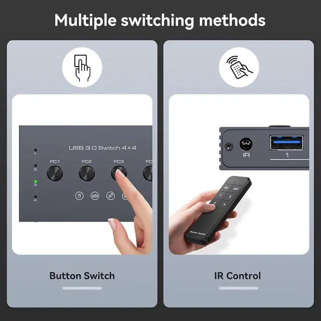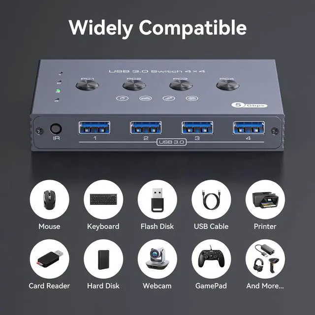 USB 3.0 Switch 4 ComputersThe 4 port USB switcher supports four computers sharing four USB 3.0 peripheral devices.No need to frequently connect cables or set up complex network sharing software, just press a button or remotely control to switch between the computers you want to use.A great choice to improve your work efficiency.Note:the usb 3.0 switch not a KVM switch, does not support HDMI/DP/VGA inputs or monitor/video transfers
