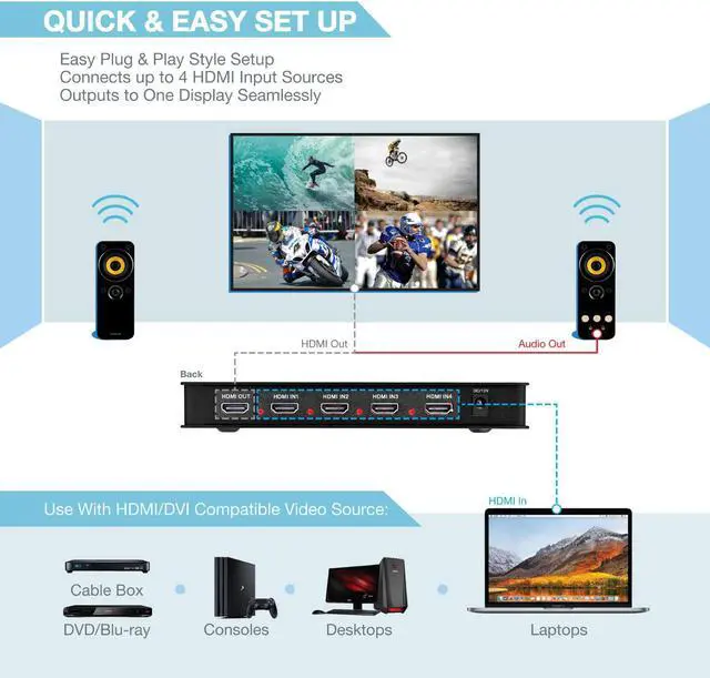 Allows 4 different HDMI devices (computer, laptop, DVD player, console etc.) display on the same screen (TV, monitor, projector) at the same time.