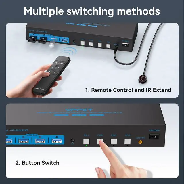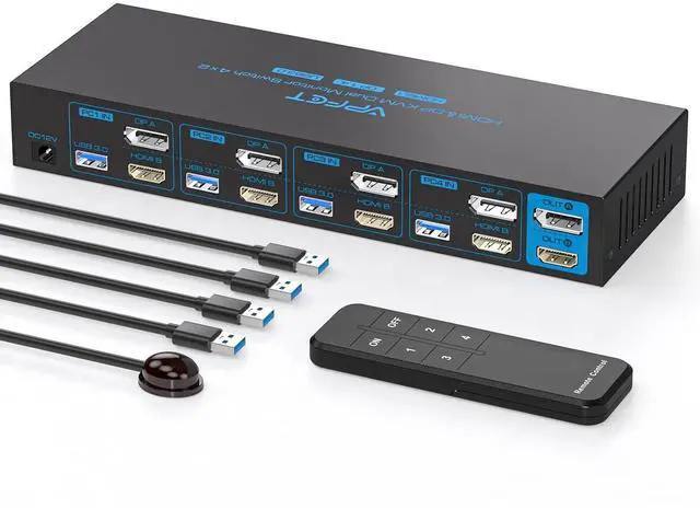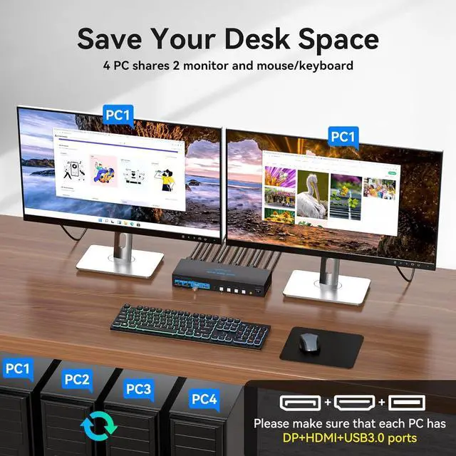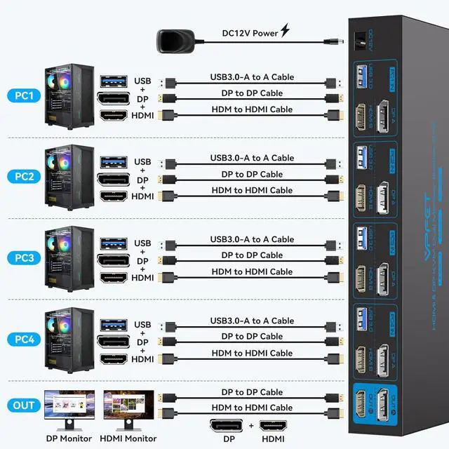 HDMI+DP KVM Switch 4 Port HDMI KVM Switch supports up to 4 PCs or laptops sharing a single monitor and a set of keyboards, mouse, printers and up to 4 USB devices. For users with multiple computers, it can greatly save costs and take up little space, you can switch between 4 computers at will, make the desktop more neat and tidy, and improve office efficiency