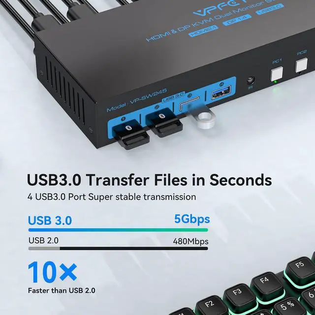 KVM Switch with 4 USB 3.0 PortsThe 4 Computer KVM Switch is equipped with four USB 3.0 ports with a maximum transfer rate of 5Gbps, allowing you to connect a variety of USB devices such as keyboards, mice, printers, scanners, etc. USB 3.0 supports hot-swapping to better protect your devices and data from damage, and is backward compatible with USB 2.0 and 1.1