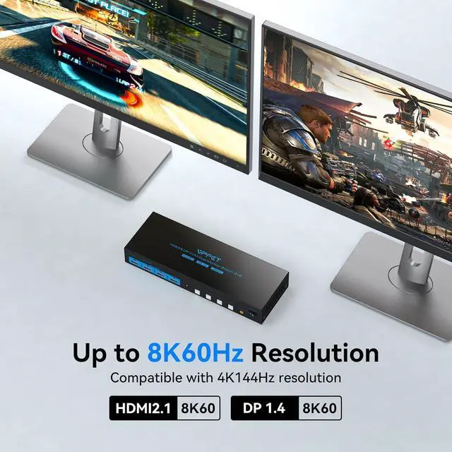 Ultra HD 8K@60HzThis KVM switch 2 monitors supports resolutions and refresh rates up to 8K@60Hz 4K@120Hz, and also supports 4K@60Hz or other lower resolution (Downward Compatible), allowing for a more accurate presentation of images, where subtle details and dynamic effects are accurately rendered. Note: To achieve these resolutions, both your computer's graphics card and monitor must support 8K@60Hz or 4K@120Hz