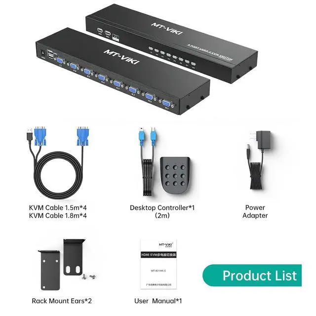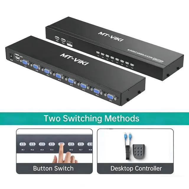 MT-VIKI 8 port kvm switch allows you to control 8 PCs by one set of keyboard/mouse/monitor.