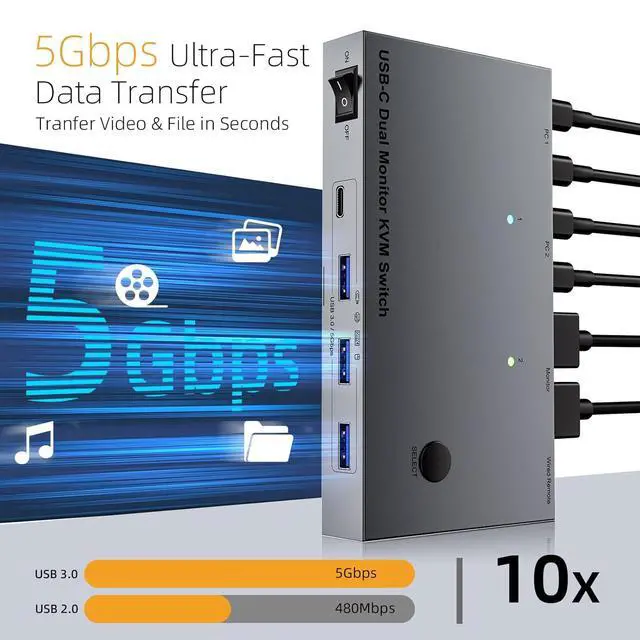 This double monitor KVM switcher display for fast 5Gbps data transfer through 4 USB3.0 port, including dedicated charging port for laptop power