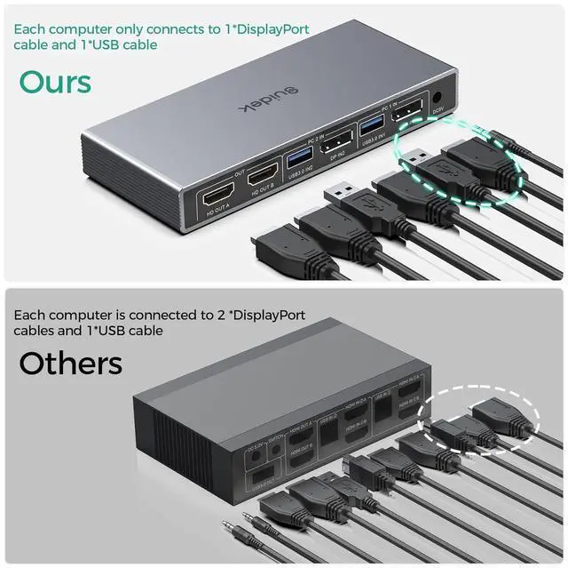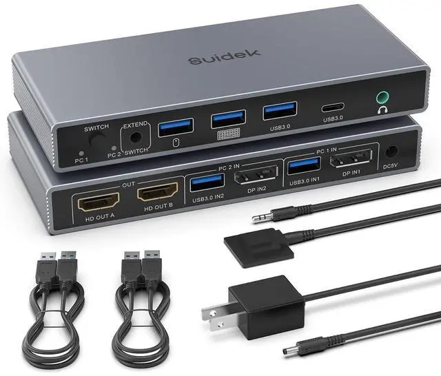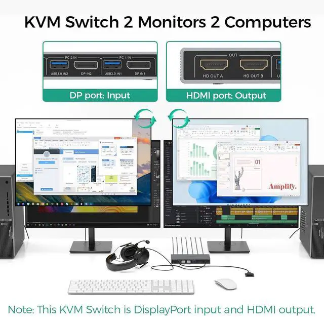 2 Monitors 2 Computers KVM Switch: This DisplayPort KVM switcher supports DisplayPort input and HDMI output, letting 2 DP computers share 2 HDMI monitors and a single mouse keyboard for unified control. Unlike complex 2-in-2-out KVM setups, SUIDEK KVM greatly simplifies connections: 1*DP and 1*USB-A per computer, 1 HDMI per monitor. NOTE: Ensure your computer has a DP interface and monitor has an HDMI interface.