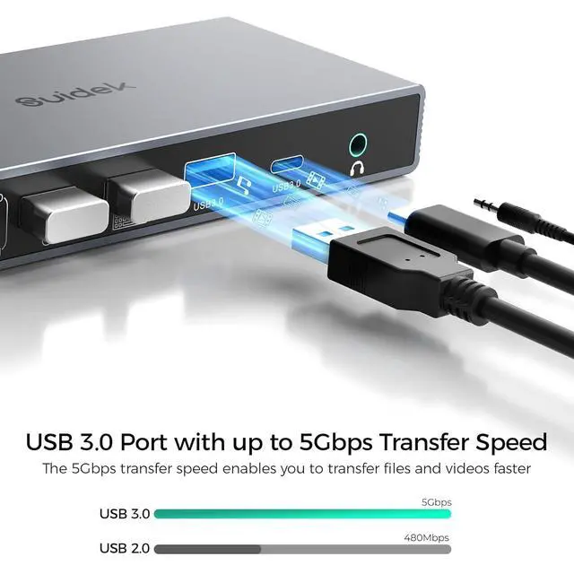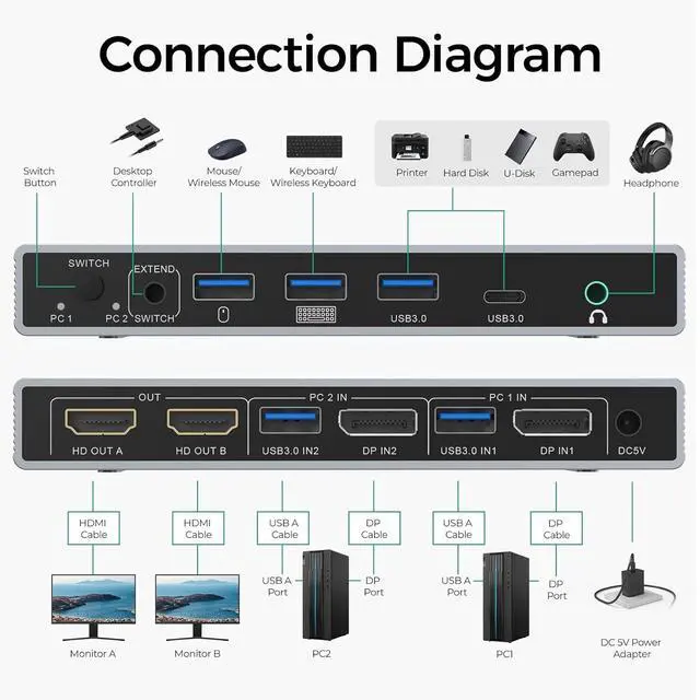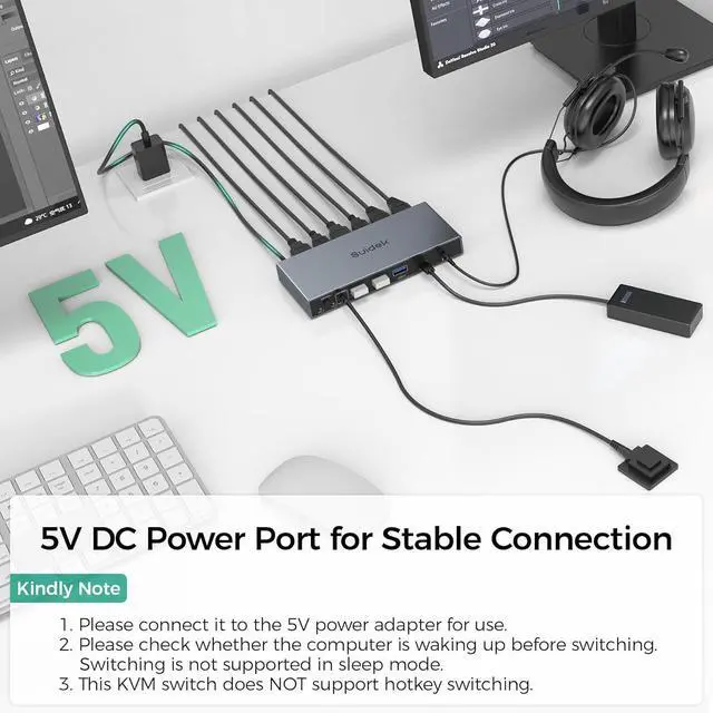 KVM Switches with 4 USB 3.0 Ports and Audio Output: This DP Keyboard Mouse KVM Switch Computers 2 Monitors has 3*USB A ports and 1*USB C port and features a headphone port for audio output. You can share one mouse, keyboard, USB flash drive, printer, etc. And the USB 3.0 ports transfer data up to 5Gbps, which can effectively improve your working efficiency. Faster transfer of pictures, files, etc. Note: Please connect the included 5V power adapter for use.