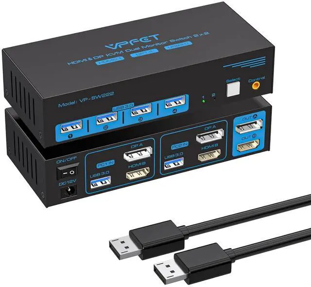 HDMI+DP Dual Monitor KVM Switch: HDMI+DP KVM switch allows two computers or laptops to share two monitors and four USB devices, just click to switch to the monitor and mouse keyboard and other devices to the other computer, no need to plug and unplug cables, simplify cabling, improve your efficiency and experience. Note: Both computers need to have 1 DP output port and 1 HDMI output port, and each of the two monitors needs to have 1 DP connector and 1 HDMI connector to use the switcher. It is re