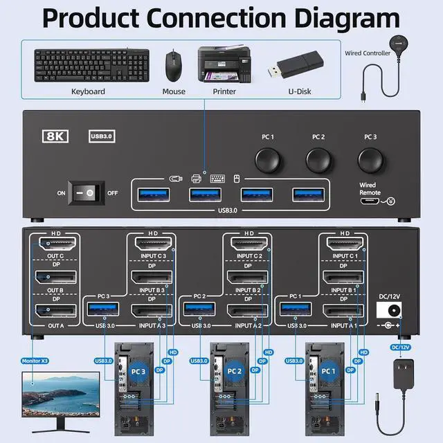 Package List 1*3 computers 3 monitors KVM switch 3*USB3.0 Cables;1*Wired remote controller ;1*User manual ;1*12V Power Adapter.If you have any problems about our KVM switches,you can contact us anytime,we can provide technical support and exchange or refund service.