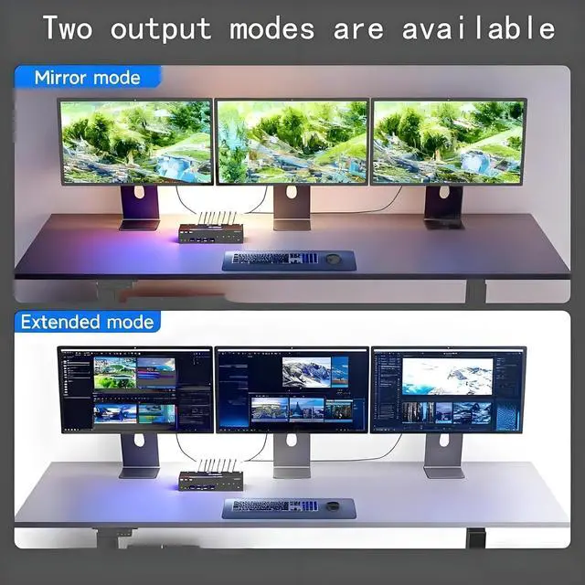 KVM switch 3 monitors 2 computers supports resolutions up to 8K@60Hz/4K@144Hz,delivering lifelike visual experiences.DP HDMI KVM switch is also backward compatible with 4K@30Hz,1080P,or lower resolutions.Note:To achieve maximum resolution,avoid using adapters or low-quality cables