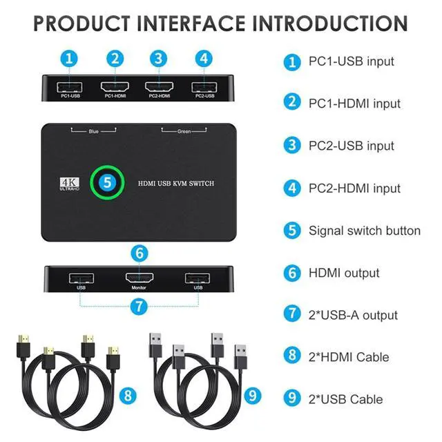 What you will Get Package includes 1*kvm switcher, 2*1.2m*USB 2.0 Cable, 2*1.2m*HDMI cables, 1*User Manual. Any problem, pls contact us to solve it.