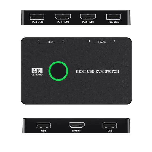 KVM HDMI SwitchThis HDMI KVM Switch allows you to control 2 computers with only one set of controls (Monitor, Mouse, Keyboard). You can easily switch between two displays. Makes your work and life much more simple and efficient. LED light color(Green or Blue) indicating the active computer.