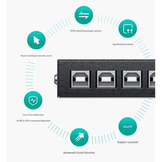Synchronizer FunctionSynchronizer USB interface realizes 4 to 1 free switching or one-button 4 -port synchronous control. As both a synchronizer and a KM switcher, You can switch between hotkey mode and synchronizer button mode, which is convenient and quick.