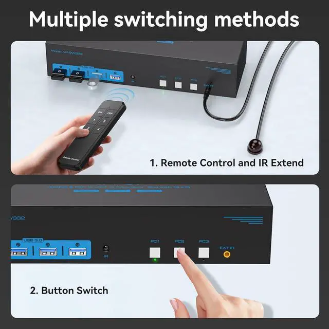 Control SwitchingThe KVM switch uses buttons on the panel to control switching in addition. It also supports control switching, you can directly to the receiver on the device panel for control switching, you can also hide the main body of the device, using the extension receiver to extend to the desktop. This is a great design for people who like to make the most of their space and like to organize. Note: Hotkey (keyboard key combination) switching is not supported.