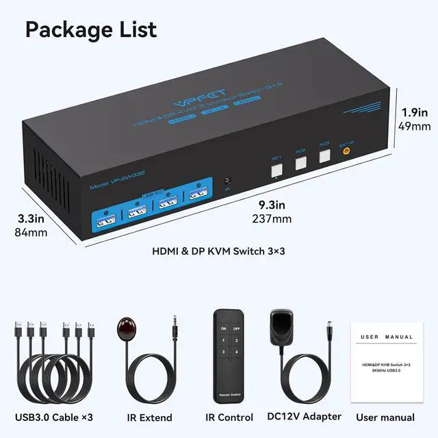 KVM Switch 3 ComputersThe HDMI Display port KVM Switch allows 3 PC or laptops to share 3 monitors and 4 USB peripherals, such as keyboards, mouse, printers, scanners, USB flash drives, etc. For users with 3 computers, it can be a great cost-saving solution and takes up little space, making it easy to centralize. You can switch between the 3 computers at will, making your desktop neater and improving your work efficiency. Note: Your computer's graphics card needs to be equipped with 2 DP ports and 1 HDMI port, and you need to use 2 monitors with DP ports and 1 monitor with HDMI port for proper display.