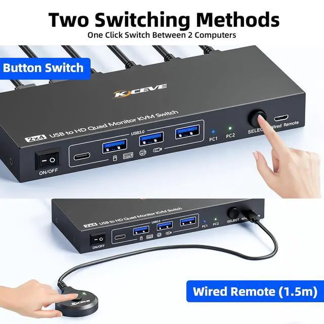 Wide Compatibility & 2 Switching WaysCamgeet USB to HDMI KVM switch is effortlessly compatible with Windows and Mac OS. Supports two switching methodsphysical button and wired remotewhile LED indicators clearly display the active computer.