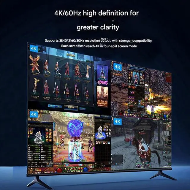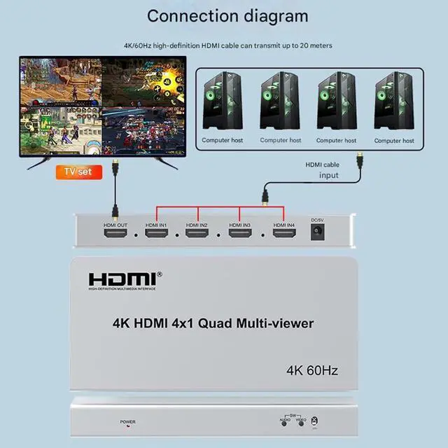 4-input, 1-output Switch This HDMI switcher is input by 4 different HDMI devices(computer, laptop, DVD player, console etc.) display on the same screen (TV, monitor, projector) at the same time.