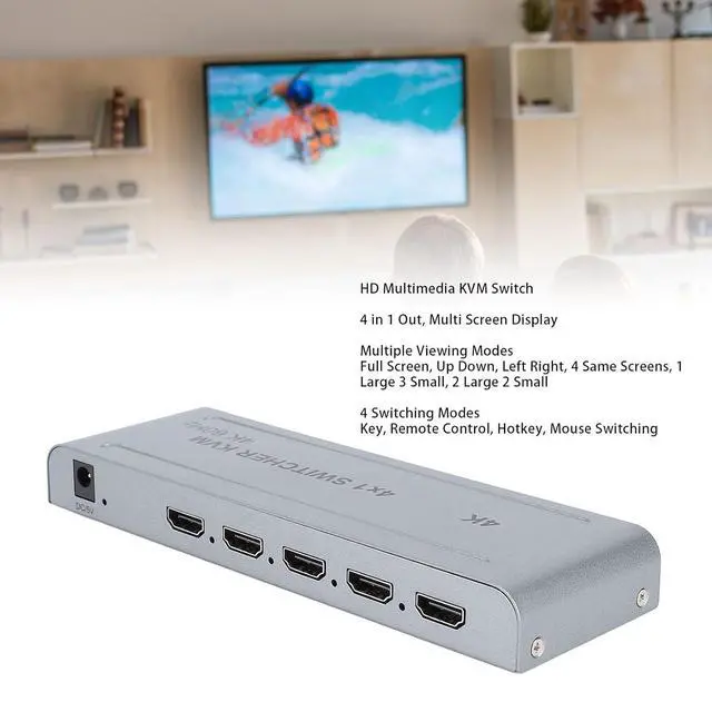 Multiple Viewing Modes: Multi screen switcher connects to the display and provides multiple viewing modes, including full screen, up down, left right, 4 same screens, 1 large 3 small, 2 large 2 small modes, flexible and easy, support key and remote control