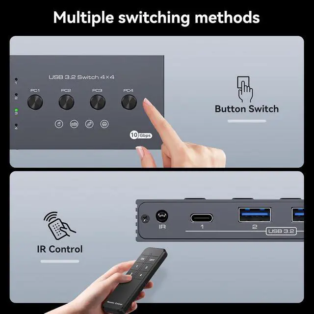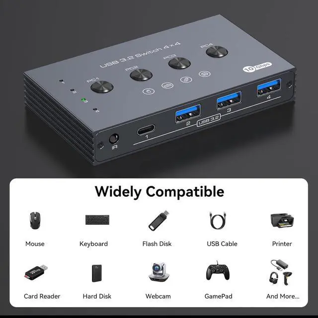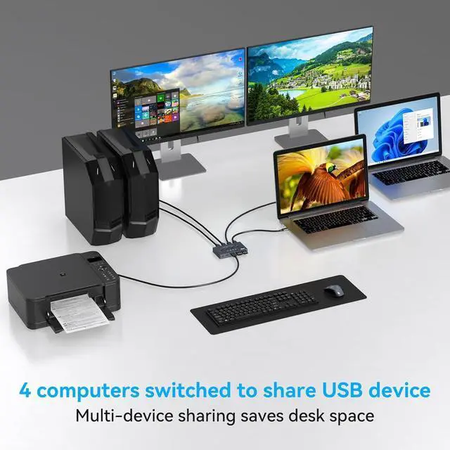 Equipped with USB Ports: switch with USB3.2; 4 USB ports to share USB devices such as keyboards, mouse, printers, UsB drives, etc. USB 3.2 Switch For 4 Computer,Note: USB-C ports do not support PD charging and video transmis