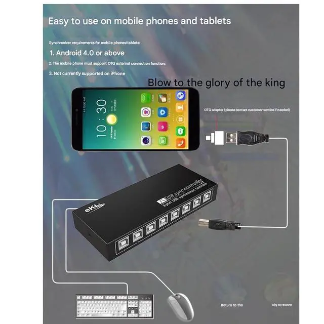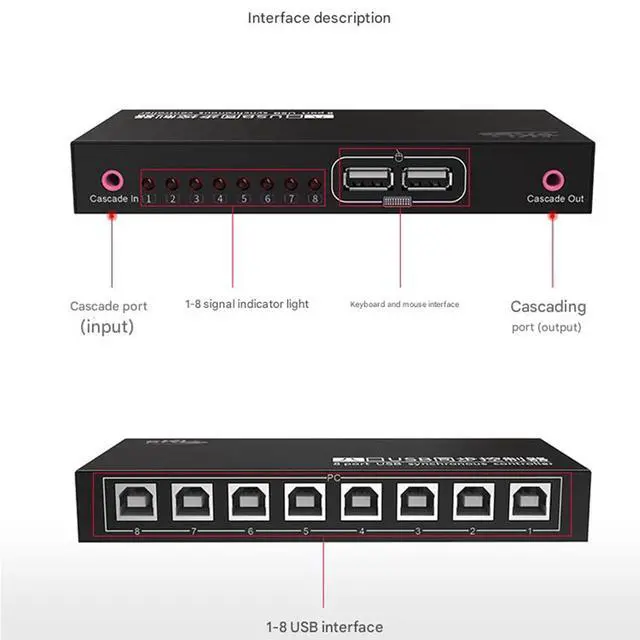 8-port computer controllerThe 8-port USB interface realizes 8 to 1 free switching or button 8-port synchronous control. As both a synchronizer and a KM switcher, You can switch between hotkey mode and synchronizer button mode, which is convenient and quick.