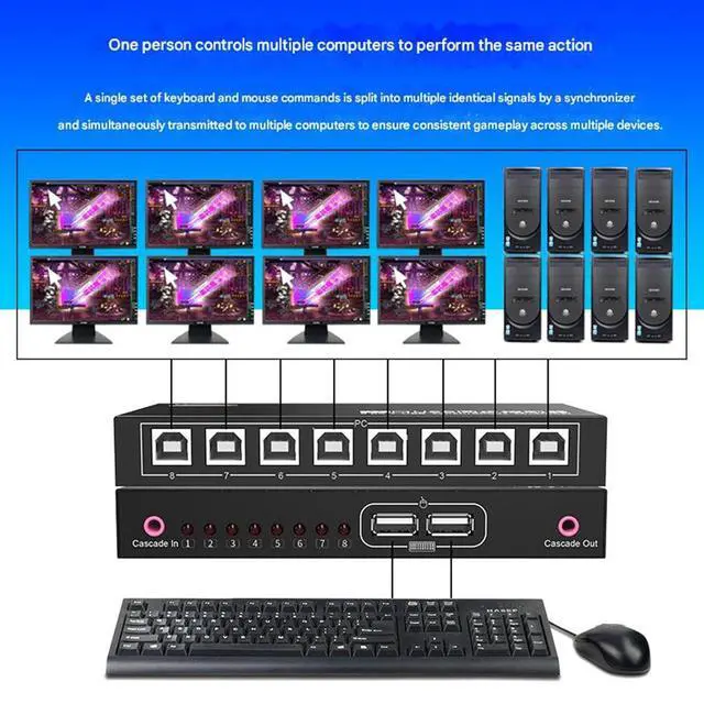 One USB keyboard and mouse can control eight computerssimultaneously.Supports mouse synchronization and cross-screen switching.