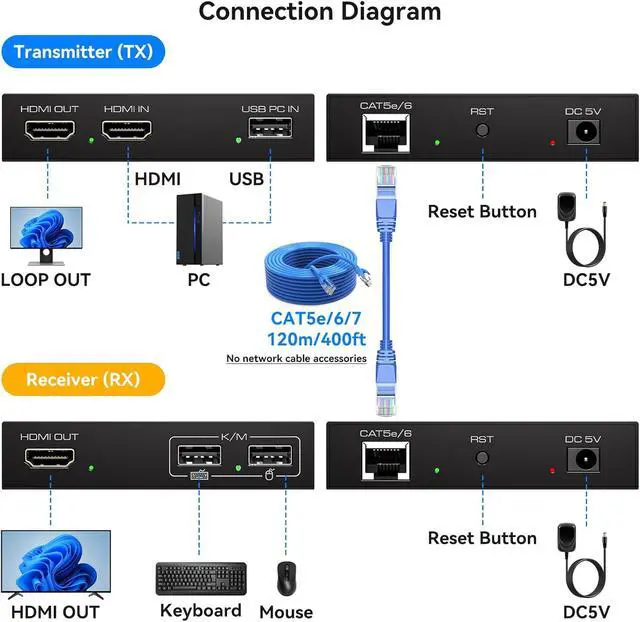 400FT/120M HDMI Extender With this HDMI KVM USB Extender, you can use a single oxygen-frees copper UTP Ethernet-cable (Cat6/7) to replace the HDMI cable to achieve long distance transmission (400FT/120M), which is a good helper for classrooms, conference rooms and home theaters. (Note: UTP cable needs to follow IEEE-568B standard)