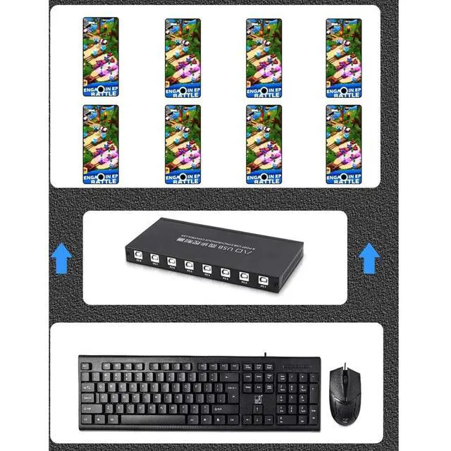 One USB keyboard and mouse can control eight computerssimultaneously.Supports mouse synchronization and cross-screen switching.