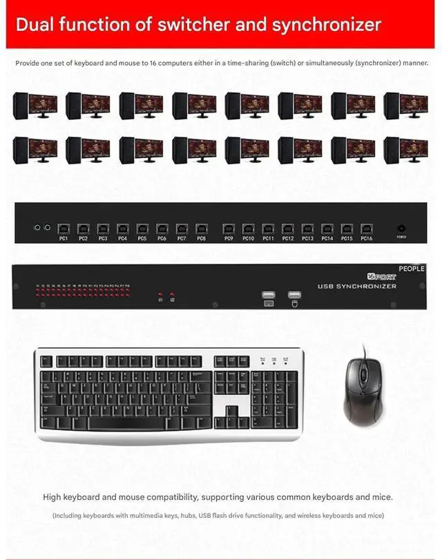 Multiple port distributors: The Multi-Port Synchronizer allows for free switching or simultaneous control of 16 ports at the touch of a button. As a KM Synchronizer, it can switch between hotkey mode and simultaneous keystroke mode for quick and easy operation.