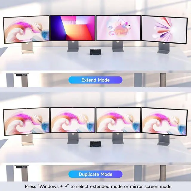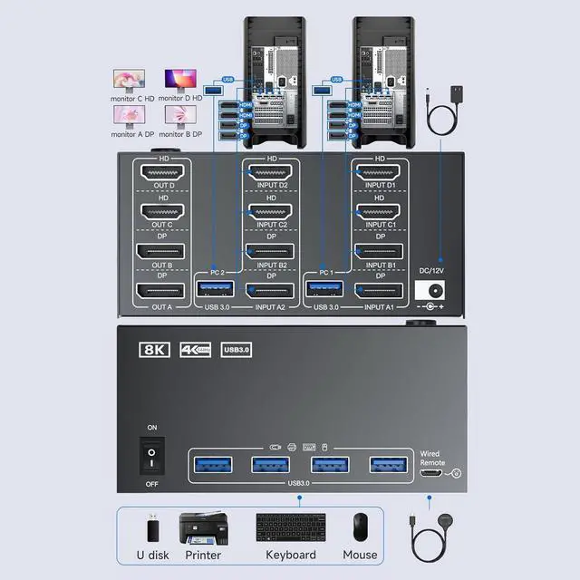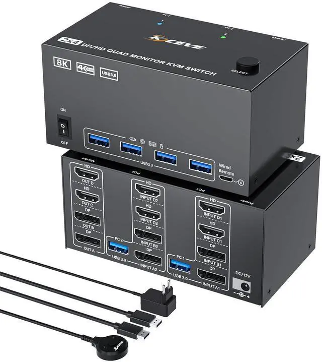 Control 2 desktop PCs on 4 monitors with our DP+HDMI matrix KVM switch. Equipped with a built-in 4-port USB 3.0 hub, it enables seamless sharing of keyboard, mouse.