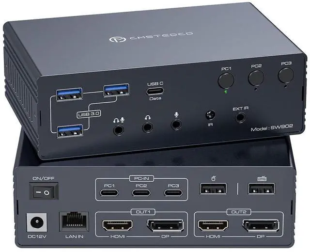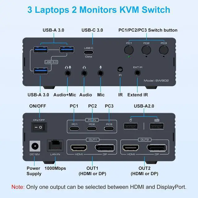 Dual 4K@60Hz DisplayThis kvm docking dual monitor is equipped with HDMI and DisplayPort dual video output interfaces, supporting dual 4K@60Hz Display. The OUT1 and OUT2 ports of the KVM switch are both equipped with HDMI and DP interfaces. You can freely choose HDMI or DP interfaces to connect each output port according to your actual needs