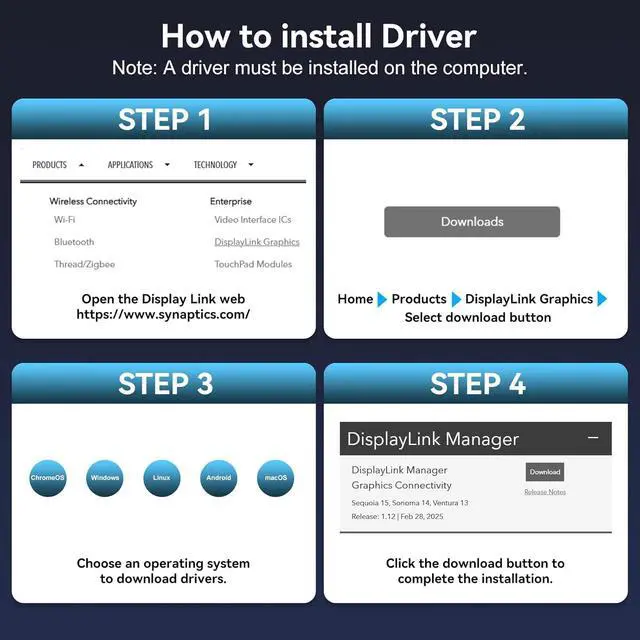 Important Notes1. DisplayLink drivers must be installed to enable full functionality (set driver to auto-start at system boot,contact technical support if issues arise during driver installation).2. USB input requires minimum USB 3.0 specification.3. Does not support PD charging.4. For 4K@60Hz operation, use high-quality cables supporting DP 1.2 and HDMI 2.0 standards (recommended length: no longer than 3.3 feet)