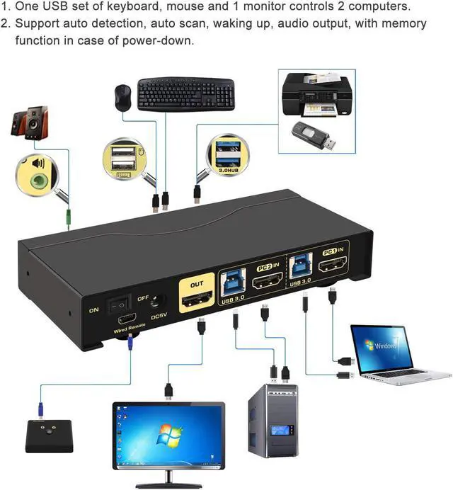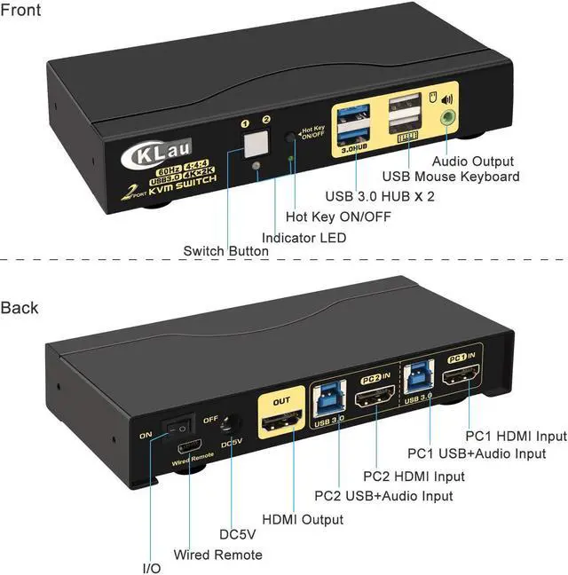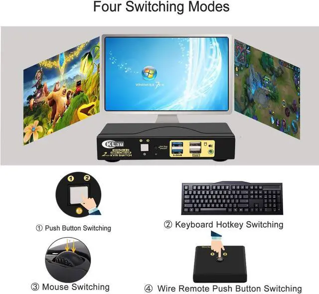 CKLau 2x1 KVM Switches USB KVM Switch 2 Port USB KVM Installation Step Connect diagram CKLau 2 Port USB KVM Switch support Emulation EDID Questions & Answers CKLau 4K60Hz 2K144Hz HDMI KVM Switch Advantage This 2x1 KVM switch Have 4 Switching Way Optional Keyboard switching