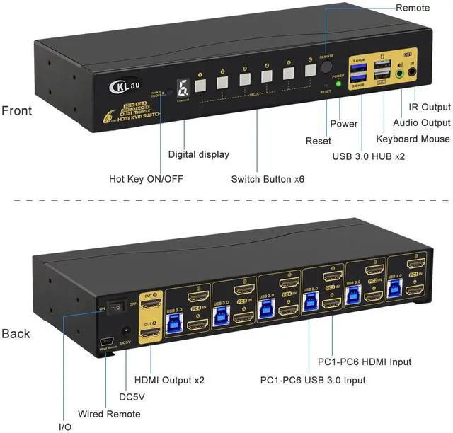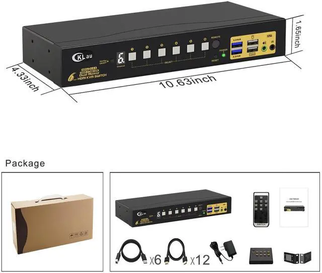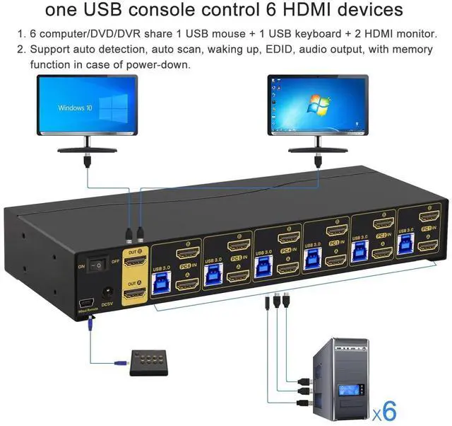 1. 6 Port KVM HDMI Switch: 6 computers in, 2 monitors out. Allows 6 computers/laptops/DVRs/NVRs sharing one set of keyboard & mouse, audio, 2 monitors and 2 pcs USB 3.0 peripheral devices. With all input cables and rank mount hook. Tips: this KVM switch required each of your computers/laptops with 2 video output. If one of your computers only with an HDMI port, only 1 monitor have display.