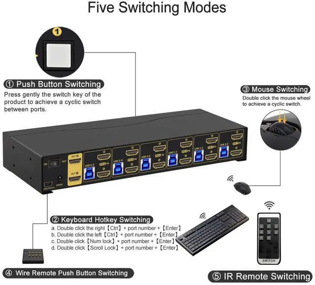3. KVM Switch Dual Monitor HDMI: Supports five switching way: keyboard hotkey switching(Num Lock + Num Lock + 1 / 2 / 3 ... + Enter, or Ctrl + Ctrl + 1 / 2 /3 ... + Enter, or Scroll Lock+ Scroll Lock+1 / 2 / 3 ... + Enter), mouse switching (click mouse wheel 2 times + left button/right button), manual button switching, IR remote switching, and wired remote push button switching.