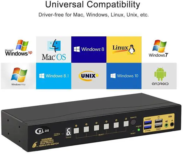 2. 6 Port KVM Switch HDMI: We are certified HDMI adopters for over 10 years. Excellent image processing and transmission capacity, make the output signal more smooth and more steady. Drive-free for Windows 10/7/2000/XP/Vista/11, Linux, Mac, Debian, Ubuntu, Fedora, Raspberry Pi, Ubuntu, etc.