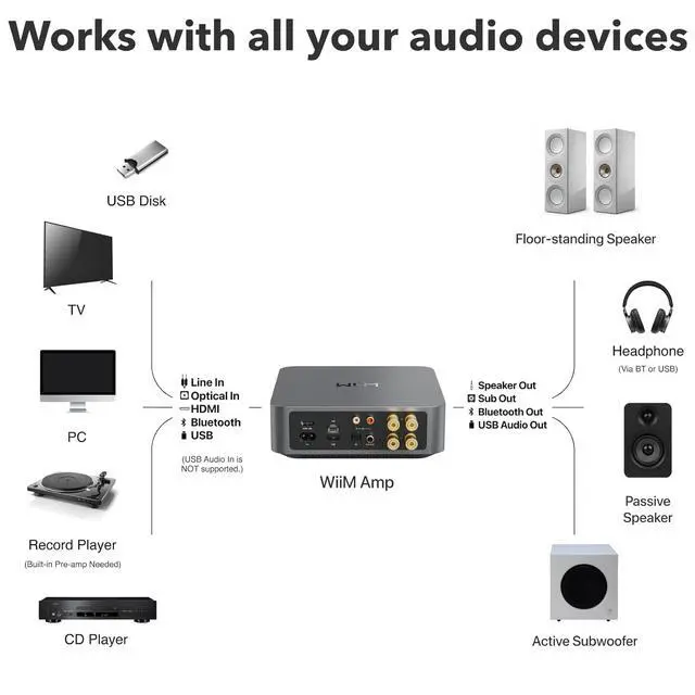 Small Yet Mighty - Transform your passive speakers into smart audio powerhouses with the WiiM Amp. Don't let its compact design fool you - this amplifier packs 60 Watts per channel at 8 ohms, and a whopping 120 Watts per channel at 4 ohms. Whether you've got floor-standing, architectural, outdoor, or bookshelf speakers, the WiiM Amp has you covered. Seamlessly connect your TV or turntable to enjoy unparalleled audio fidelity that will elevate your listening experience to new heights.
