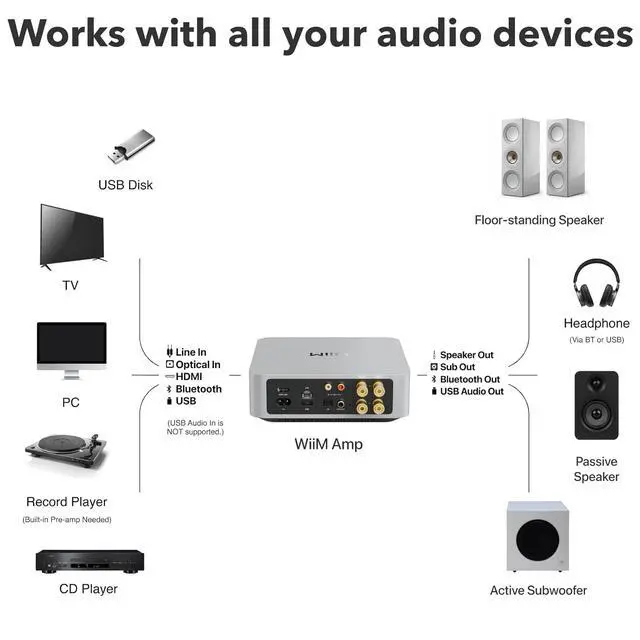 Small Yet Mighty - Transform your passive speakers into smart audio powerhouses with the WiiM Amp. Don't let its compact design fool you - this amplifier packs 60 Watts per channel at 8 ohms, and a whopping 120 Watts per channel at 4 ohms. Whether you've got floor-standing, architectural, outdoor, or bookshelf speakers, the WiiM Amp has you covered. Seamlessly connect your TV or turntable to enjoy unparalleled audio fidelity that will elevate your listening experience to new heights.