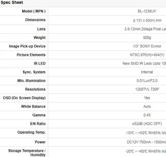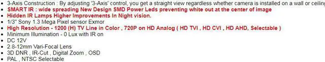 The camera is powered by Sony 1.3Mega Pixel Sensor chipset that is embodied the top grade of the world at 1200 TVL resolution be own image signal technology which is to change the frequency of luminance signal adaptively by a monitoring sector.