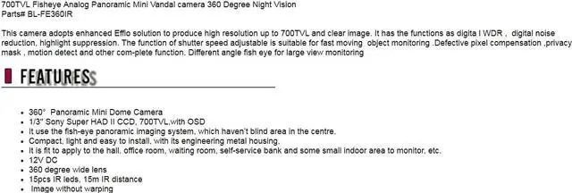 This camera adopts enhanced Effio solution to produce high resolution up to 700TVL and clear image. It has the functions as digita l WDR , digital noise reduction, highlight suppression. The function of shutter speed adjustable is suitable for fast moving object monitoring .Defective pixel compensation ,privacy mask , motion detect and other com-plete function. Different angle fish eye for large view monitoring