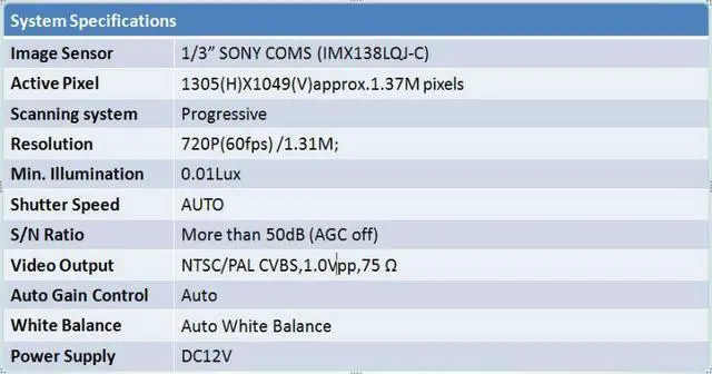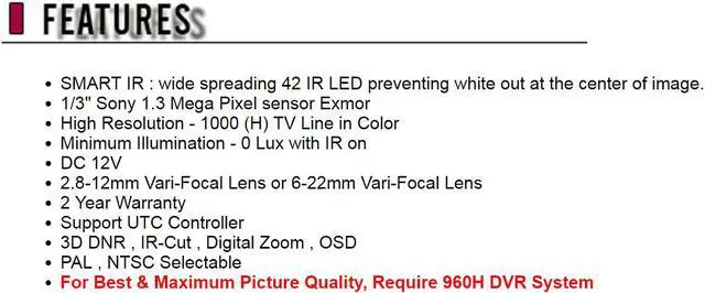 SMART IR: wide spreading 42 IR LED preventing white out at the center of image. 1/3" Sony 1.3 Mega Pixel sensor Exmor High Resolution - 1000 (H) TV Line in Color Minimum Illumination - 0 Lux with IR on DC 12V 2.8 -12mm Vari-Focal Lens or 6-22mm Vari-Focal Lens 2 Year Warranty Support UTC Controller 3D DNR, IR-Cut, Digital Zoom, OSD PAL, NTSC Selectable For Best & Maximum Picture Quality, Require 960H DVR System