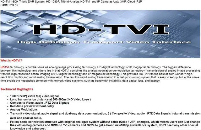 Follow same connection structure with original analogue system without cable (Coax / UTP) changed, which means users can just change their old analog cameras and DVRs to TVI cameras and DVRs to get a brand new1080p surveillance system, don’t need any other special knowledge and extra cost.