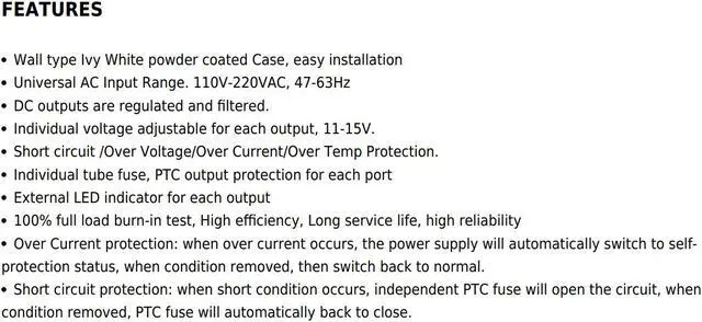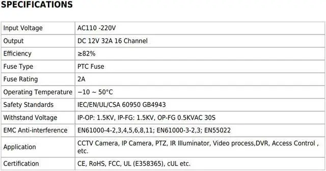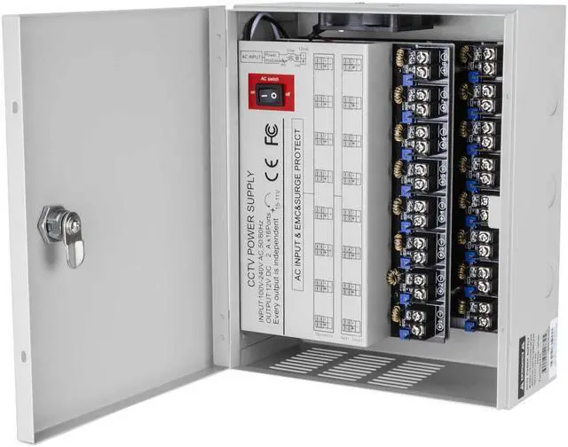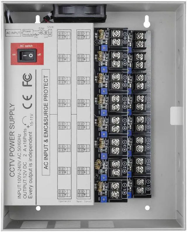 CCTV Camera Power Supply Distribution Box - 12V DC 16 channel 32 Amps UL Listed PTC Fused, Individual voltage adjustable for each output, 11-15V