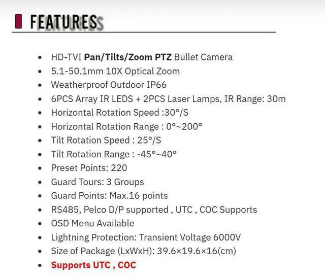 12. RS485, Pelco D/P supported , UTC , COC Supports