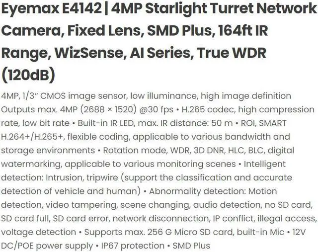 1/3 CMOS image sensor, low illuminance, high image definition Outputs max. 4MP (2688 × 1520) @30fps
