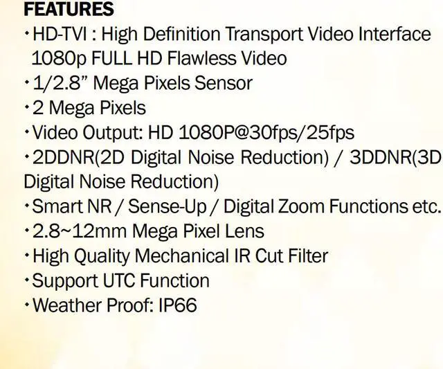 HD-TVI: High Definition Transport Video Interface 1080p FULL HD Flawless Video 1/ 2.8 ” Mega Pixels Sensor 2 Mega