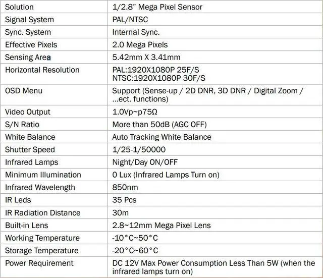 Pixels Video Output: HD 1080P@30fps/25fps 2DDNR (2D Digital Noise Reduction) / 3DDNR (3D Digital Noise Reduction) Smart NR / Sense-Up / Digital Zoom Functions etc. 2.8 ~12mm Mega Pixel Lens High Quality Mechanical IR Cut Filter Support UTC
