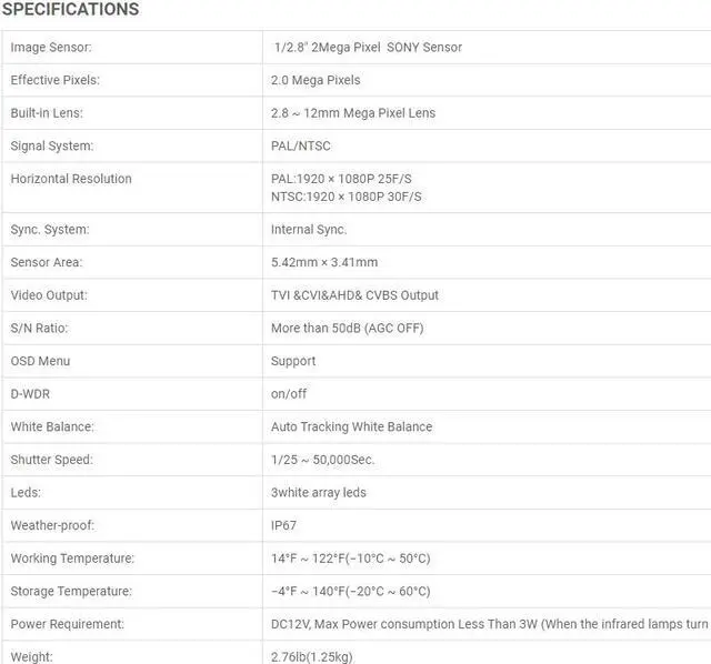Eyemax TIR-1252VSL-B HD-TVI 1080P Outdoor Bullet Camera, 2.8-12mm, 72 IR LED 12V DC