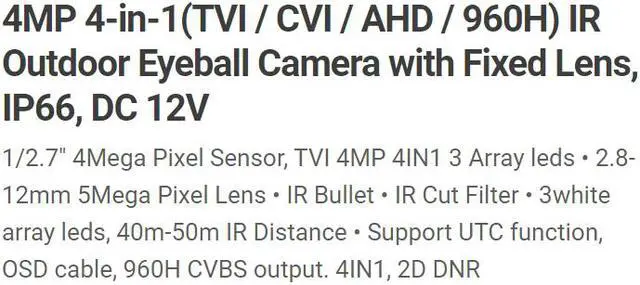 Eyemax TIR-B4352V HD-TVI 4MP Outdoor Bullet Camera, 2.8-12mm, 12V DC